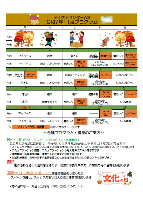 デイケアWill 11月のプログラムを更新しました